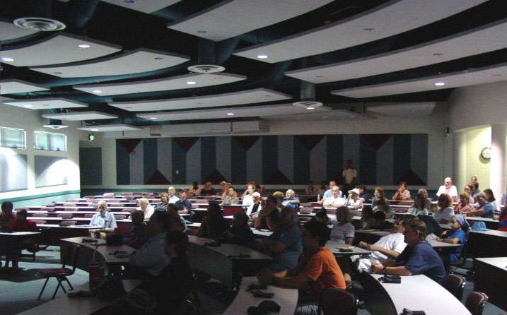 Meetings are held on the last Tuesday of the month. The meetings are held on the Campus of IRSC in Ft. Pierce in the Science Building "N". Either at the west end, in the lecture hall pictured above or on special occasion, in the planetarium on the east end of the building. It is convenient to park in the parking lot that is south of the building. The public is welcome at all meetings. |